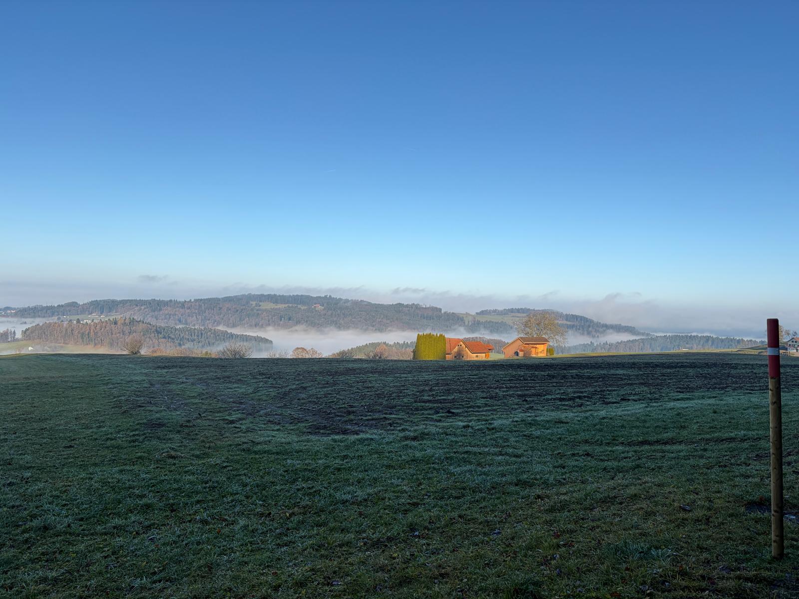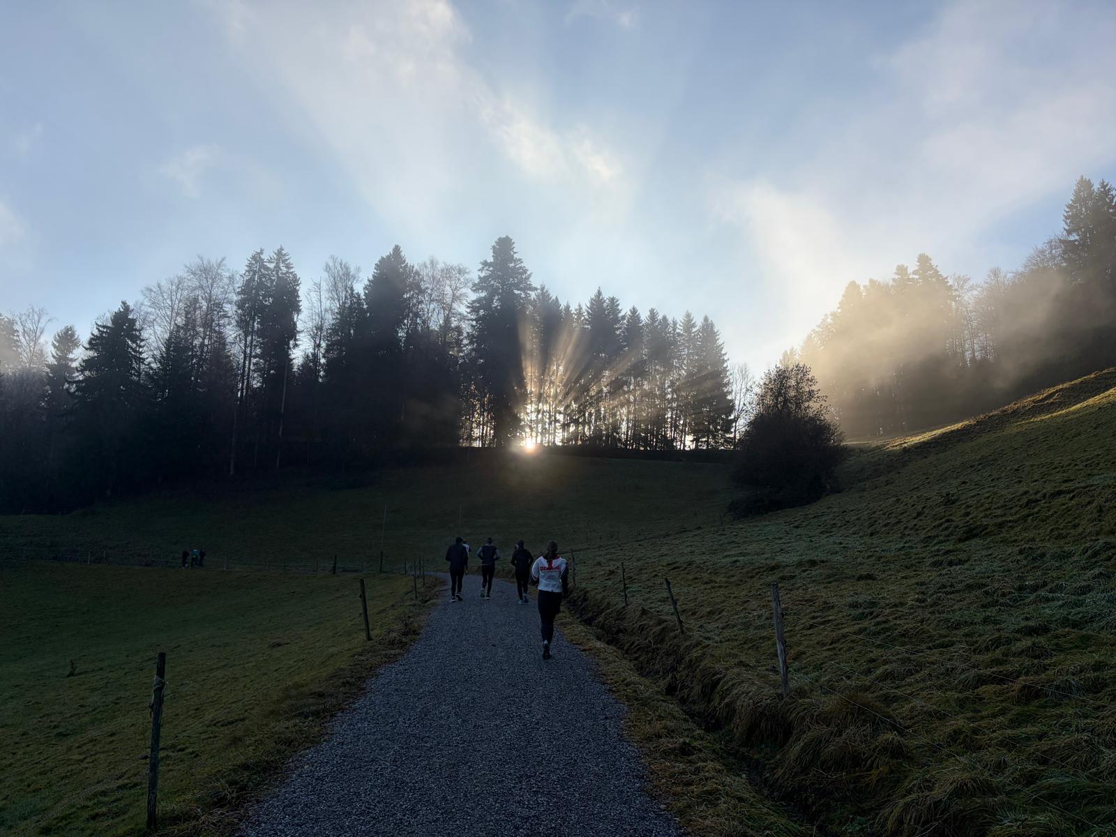 Was gibt es Schöneres, als an einem trüben Dezembertag die Laufschuhe zu schnüren und gemeinsam das Grau hinter sich zu lassen? Genau das dachten sich heute auch 9 motivierte Freizeitsportler, die sich mit Guide Fränzi auf den Weg machten, um den Hittnauer Trail unsicher zu machen. Wer den Hittnauer Trail kennt, weiss: Es wird nicht langweilig! Die Strecke verlangte uns heute einiges ab. Es ging stetig hoch und ab, ein «angenehm coupiertes» Profil, das den Puls ordentlich in die Höhe trieb und die Waden forderte. Aber die Mühe hat sich mehr als gelohnt. Während das Unterland noch unter einer dicken Decke schlummerte, wurden wir für jeden Höhenmeter belohnt. Plötzlich riss der Himmel auf und wir durften herrliche sonnige Abschnitte über dem Nebel geniessen. Dieser Moment, wenn man aus der grauen Suppe in den strahlenden Sonnenschein läuft, ist einfach unbezahlbar und zauberte jedem ein Lächeln ins Gesicht.