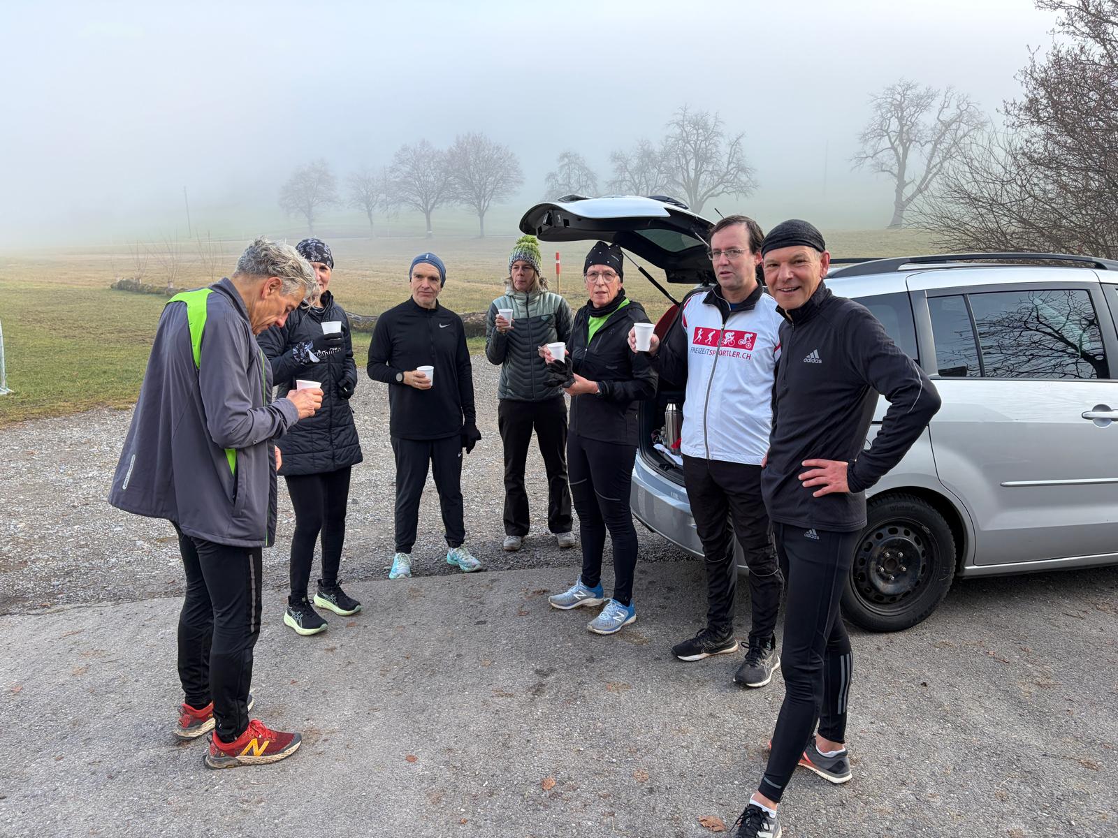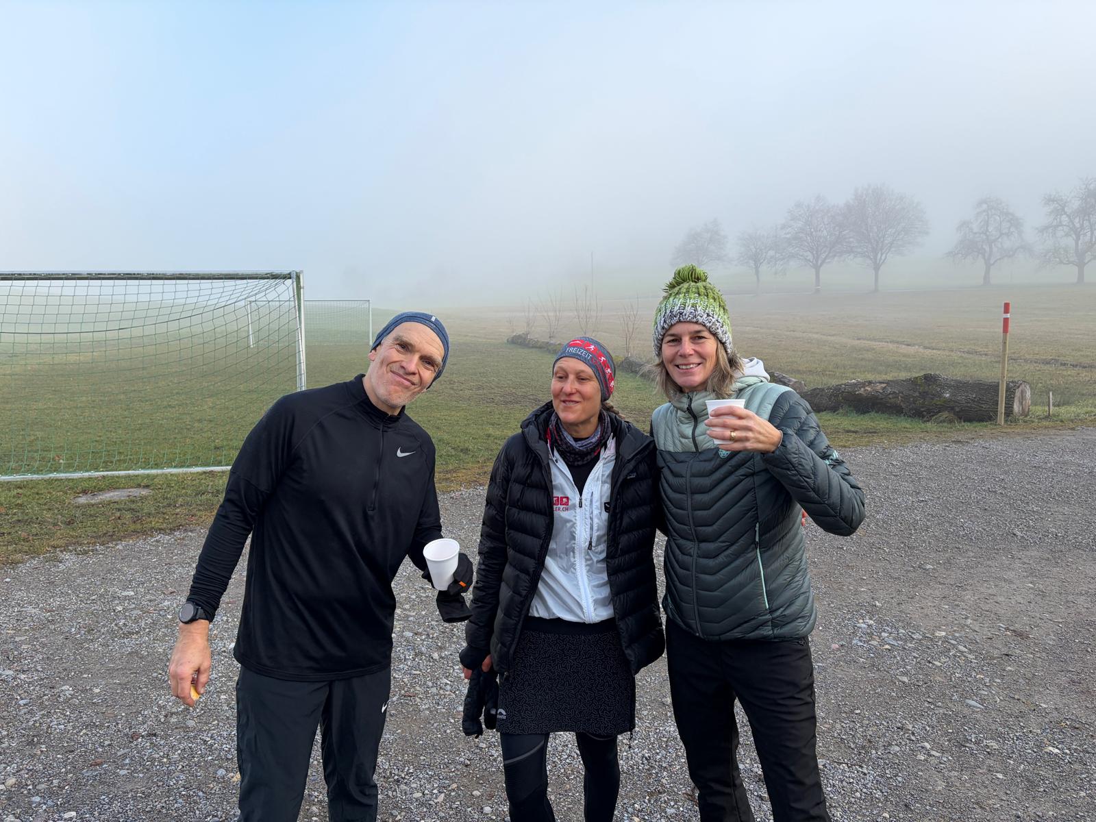 Nachdem wir die Höhenmeter gemeistert und den Trail genossen hatten, wartete im Ziel das absolute Highlight auf uns. Völlig überraschend empfing uns Yvonne mit einem "Verpflegungsposten deluxe"! Es gab heissen Tee und Punch zum Aufwärmen und – passend zur Jahreszeit – feine Guetzli. Ein riesiges Dankeschön an Yvonne für diese wunderbare Geste! Das gemeinsame Anstossen und Knabbern war der perfekte Abschluss für diesen gelungenen Lauf.